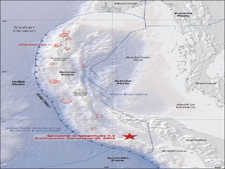 The 2004 Asian Earthquake-Magnitude 9. 3 Location: OFF THE WEST COAST OF NORTHERN SUMATRA The devastating megathrust earthquake of December 26 th, 2004 occurred on the interface of the India and Burma plates and was caused by the release of stresses that develop as the India plate subducts beneath the overriding Burma plate. The India plate begins its descent into the mantle at the Sunda trench which lies to the west of the earthquake's epicenter. The trench is the surface expression of the plate interface between the Australia and India plates, situated to the southwest of the trench, and the Burma and Sunda plates, situated to the northeast Distances: 250 km (155 miles) SSE of Banda Aceh, Sumatra, Indonesia 310 km (195 miles) W of Medan, Sumatra, Indonesia 1260 km (780 miles) SSW of BANGKOK, Thailand 1605 km (990 miles) NW of JAKARTA, Java, Indonesia