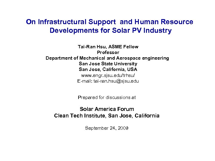 On Infrastructural Support and Human Resource Developments for Solar PV Industry Tai-Ran Hsu, ASME Fellow Professor Department of Mechanical and Aerospace engineering San Jose State University San Jose, California, USA www. engr. sjsu. edu/trhsu/ E-mail: tai-ran. hsu@sjsu. edu Prepared for discussions at Solar America Forum Clean Tech Institute, San Jose, California September 24, 2009