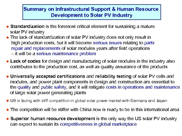 Summary on Infrastructural Support & Human Resource Development to Solar PV Industry ● Standardization is the foremost critical element for sustaining a mature solar PV industry ● The lack of standardization of solar PV industry does not only result in high production costs, but it will become serious issues relating to parts repair and replacements of solar modules years after field operations – it will be a serious maintenance problem ● Lack of codes for design and manufacturing of solar modules in the industry also contributes to the production cost, as well as quality assurance of the products ● Universally accepted certifications and reliability testing of solar PV cells and modules, and power plant components in design and construction are essential to the quality and public safety, and it will mitigate costs in operations and maintenance of large solar power generating plants ● US is facing with stiff competition in global solar power market with Germany and Japan ● The competition will be stiffer with China now is ready to be in this international area ● Superior human resource development is the only way the US solar PV industry can expect to sustain its competitiveness in global marketplace