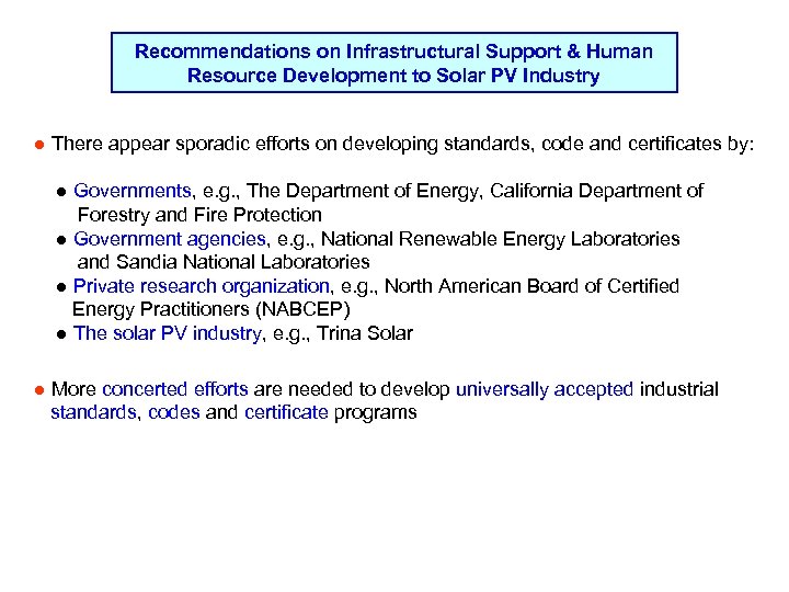 Recommendations on Infrastructural Support & Human Resource Development to Solar PV Industry ● There appear sporadic efforts on developing standards, code and certificates by: ● Governments, e. g. , The Department of Energy, California Department of Forestry and Fire Protection ● Government agencies, e. g. , National Renewable Energy Laboratories and Sandia National Laboratories ● Private research organization, e. g. , North American Board of Certified Energy Practitioners (NABCEP) ● The solar PV industry, e. g. , Trina Solar ● More concerted efforts are needed to develop universally accepted industrial standards, codes and certificate programs