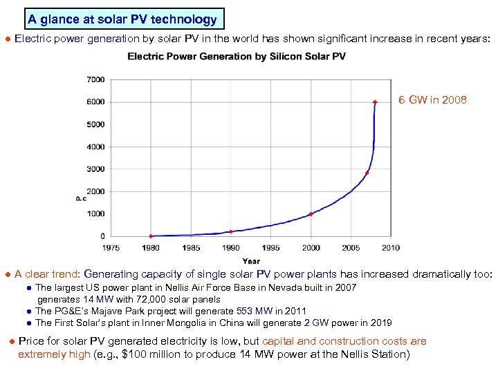 A glance at solar PV technology ● Electric power generation by solar PV in the world has shown significant increase in recent years: 6 GW in 2008 ● A clear trend: Generating capacity of single solar PV power plants has increased dramatically too: ● The largest US power plant in Nellis Air Force Base in Nevada built in 2007 generates 14 MW with 72, 000 solar panels ● The PG&E’s Majave Park project will generate 553 MW in 2011 ● The First Solar’s plant in Inner Mongolia in China will generate 2 GW power in 2019 ● Price for solar PV generated electricity is low, but capital and construction costs are extremely high (e. g. , $100 million to produce 14 MW power at the Nellis Station)