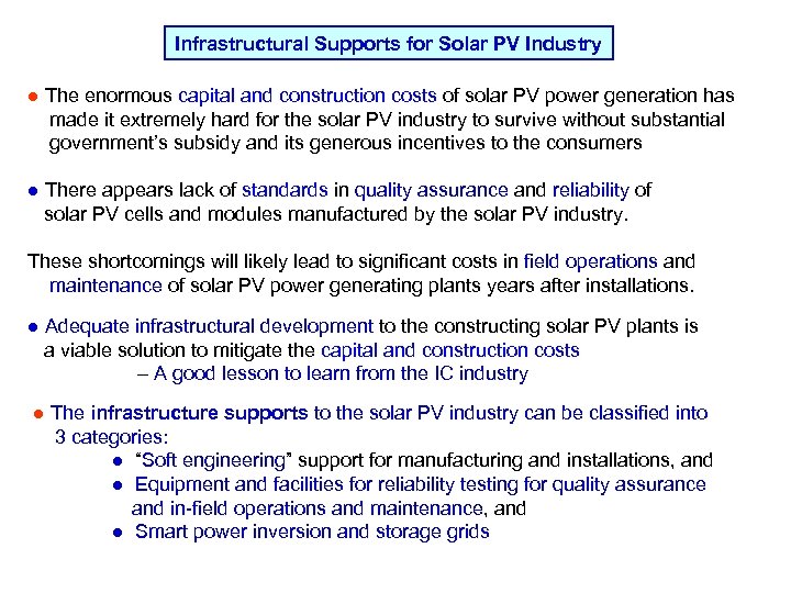 Infrastructural Supports for Solar PV Industry ● The enormous capital and construction costs of solar PV power generation has made it extremely hard for the solar PV industry to survive without substantial government’s subsidy and its generous incentives to the consumers ● There appears lack of standards in quality assurance and reliability of solar PV cells and modules manufactured by the solar PV industry. These shortcomings will likely lead to significant costs in field operations and maintenance of solar PV power generating plants years after installations. ● Adequate infrastructural development to the constructing solar PV plants is a viable solution to mitigate the capital and construction costs – A good lesson to learn from the IC industry ● The infrastructure supports to the solar PV industry can be classified into 3 categories: ● “Soft engineering” support for manufacturing and installations, and ● Equipment and facilities for reliability testing for quality assurance and in-field operations and maintenance, and ● Smart power inversion and storage grids