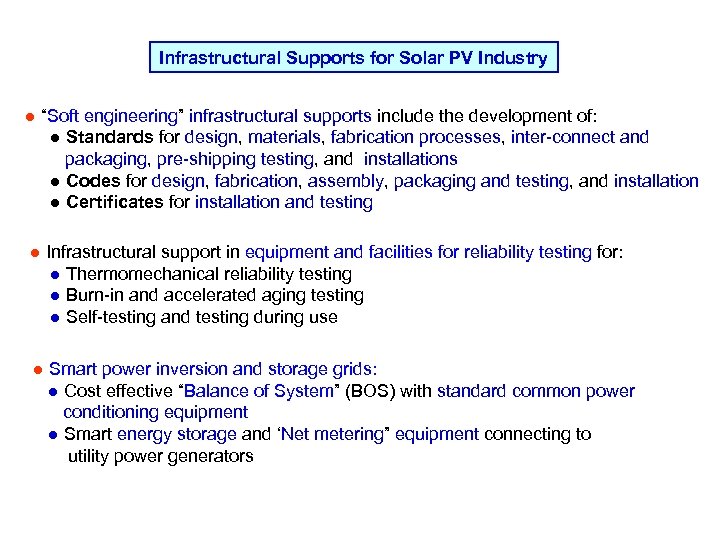 Infrastructural Supports for Solar PV Industry ● “Soft engineering” infrastructural supports include the development of: ● Standards for design, materials, fabrication processes, inter-connect and packaging, pre-shipping testing, and installations ● Codes for design, fabrication, assembly, packaging and testing, and installation ● Certificates for installation and testing ● Infrastructural support in equipment and facilities for reliability testing for: ● Thermomechanical reliability testing ● Burn-in and accelerated aging testing ● Self-testing and testing during use ● Smart power inversion and storage grids: ● Cost effective “Balance of System” (BOS) with standard common power conditioning equipment ● Smart energy storage and ‘Net metering” equipment connecting to utility power generators