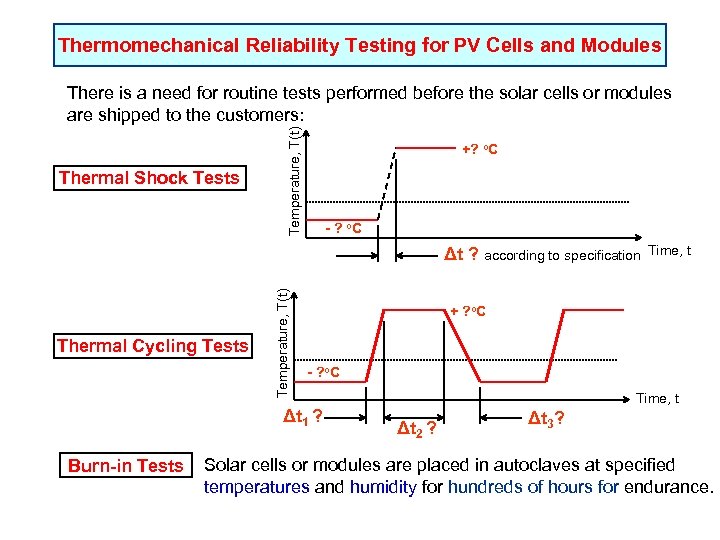 Thermomechanical Reliability Testing for PV Cells and Modules Thermal Shock Tests Temperature, T(t) There is a need for routine tests performed before the solar cells or modules are shipped to the customers: +? o. C - ? o. C Thermal Cycling Tests Temperature, T(t) Δt ? according to specification + ? o. C - ? o. C Δt 1 ? Burn-in Tests Time, t Δt 2 ? Δt 3? Solar cells or modules are placed in autoclaves at specified temperatures and humidity for hundreds of hours for endurance.