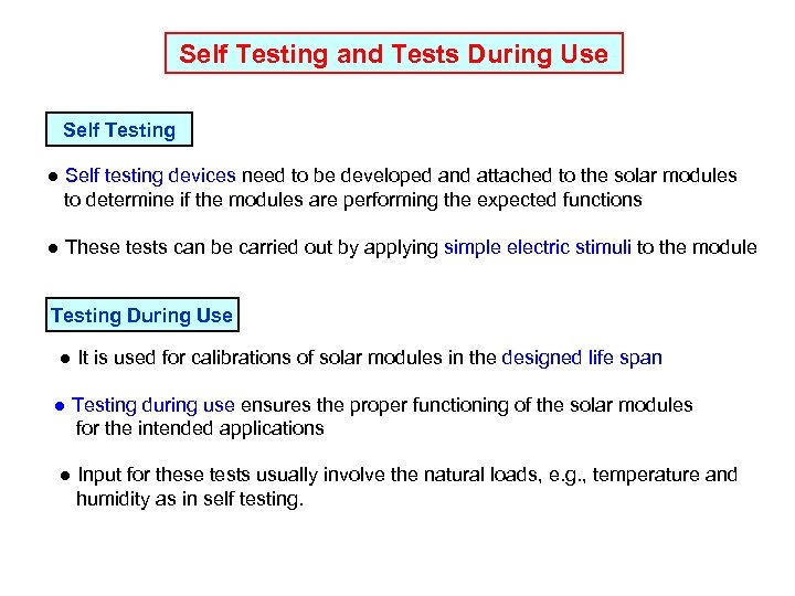 Self Testing and Tests During Use Self Testing ● Self testing devices need to be developed and attached to the solar modules to determine if the modules are performing the expected functions ● These tests can be carried out by applying simple electric stimuli to the module Testing During Use ● It is used for calibrations of solar modules in the designed life span ● Testing during use ensures the proper functioning of the solar modules for the intended applications ● Input for these tests usually involve the natural loads, e. g. , temperature and humidity as in self testing.
