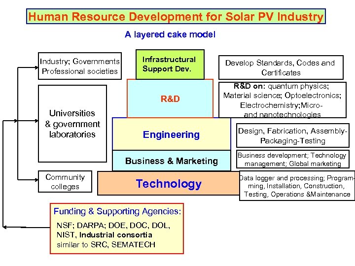 Human Resource Development for Solar PV Industry A layered cake model Industry; Governments Professional societies Infrastructural Support Dev. R&D Universities & government laboratories Develop Standards, Codes and Certificates R&D on: quantum physics; Material science; Optoelectronics; Electrochemistry; Microand nanotechnologies Design, Fabrication, Assembly. Packaging-Testing Business & Marketing Community colleges Engineering Business development; Technology management; Global marketing Technology Funding & Supporting Agencies: NSF; DARPA; DOE, DOC, DOL, NIST, Industrial consortia similar to SRC, SEMATECH Data logger and processing; Programming, Installation, Construction, Testing, Operations &Maintenance