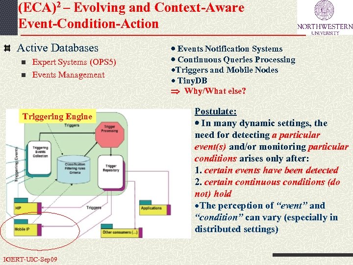 (ECA)2 – Evolving and Context-Aware Event-Condition-Action Active Databases n n Expert Systems (OPS 5) Events Management Triggering Engine IGERT-UIC-Sep 09 Events Notification Systems Continuous Queries Processing ·Triggers and Mobile Nodes · Tiny. DB Why/What else? Postulate: In many dynamic settings, the need for detecting a particular event(s) and/or monitoring particular conditions arises only after: 1. certain events have been detected 2. certain continuous conditions (do not) hold ·The perception of “event” and “condition” can vary (especially in distributed settings)