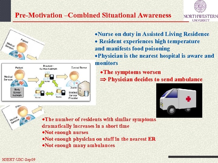 Pre-Motivation –Combined Situational Awareness ·Nurse on duty in Assisted Living Residence · Resident experiences high temperature and manifests food poisoning ·Physician is the nearest hospital is aware and monitors ·The symptoms worsen Physician decides to send ambulance ·The number of residents with similar symptoms dramatically increases in a short time ·Not enough nurses ·Not enough physician on staff in the nearest ER ·Not enough many ambulances IGERT-UIC-Sep 09