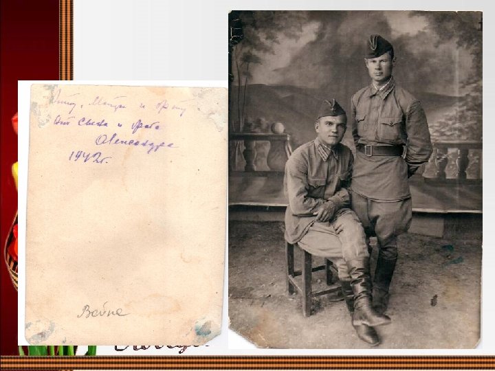• Приезжая домой на побывку он привозил патефон, заводил музыку, устраивал танцы и веселил всех девушек, так вспоминает о нём подруга прабабушки Клавы (слева на фото) , Ляхова т. Люба (справа на фото)