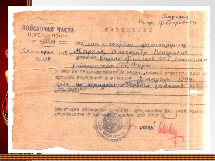 • На имя отца Маркова Петра Фёдоровича пришло извещение с войсковой части полевой почты № 45036 от 26 марта 1944 года за № 189 о том, что ваш сын - гвардии красноармеец Марков Александр Петрович, уроженец Карело – Финской ССР Олонецкого района села Большие Горы в бою за социалистическую Родину, верный воинской присяге проявив геройство и мужество 9 марта 1944 года не вернулся с боевого задания (пропал без вести).