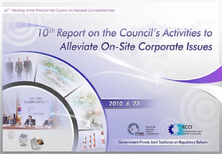 Strengthened Efforts to Identify Corporate Issues Local On-Site Roundtables : Continued on-site visits will be made to check negative factors for regional development and local business growth. - Yongin, Daegu, Jeju and Masan will be visited between June and July 2010. Seoul Small Business Roundtables : Regulation related to livelihood issues of small shop owners and companies will be identified - Active involvement of Seoul District Chambers will be encouraged. (Meetings will be held in Yongsan and Jungryang districts in June 2010) Cooperation among Economic Organizations : Cooperative mechanism will be strengthened for effective identification of recommendation issues and monitoring of implemented measures. Industry Roundtables : Industry-specific issues in retail, logistics and engineering will be identified (by cooperating with relevant industry associations). Close Monitoring of Implementation Issues Reported to the Council for National Competitiveness : Monthly implementation status will be monitored and follow-up actions will be reported. Other Issues : Monitoring will take place every half-year. 21