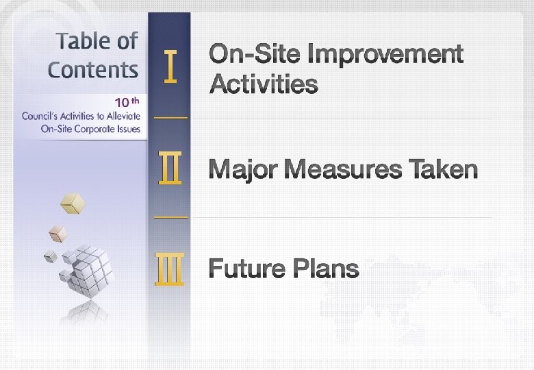 Improvements - On-Site Corporate Issues Location Environment Housing Construction Improvements were made on excessive approval & licensing standard and procedures Resolution of facility expansionrelated difficulties within the Nature Conservation Zone Mindset change in how a proenvironment business is defined Resolution of issues related to pollutant emission control Improvement in the construction sites regulations (to reflect the actual situation) Creation of conflict management mechanism in the housing construction business on-site issues 19 Cases on-site issues 7 Cases on-site issues 13 Cases 17 Cases improved 11 Cases improved 4