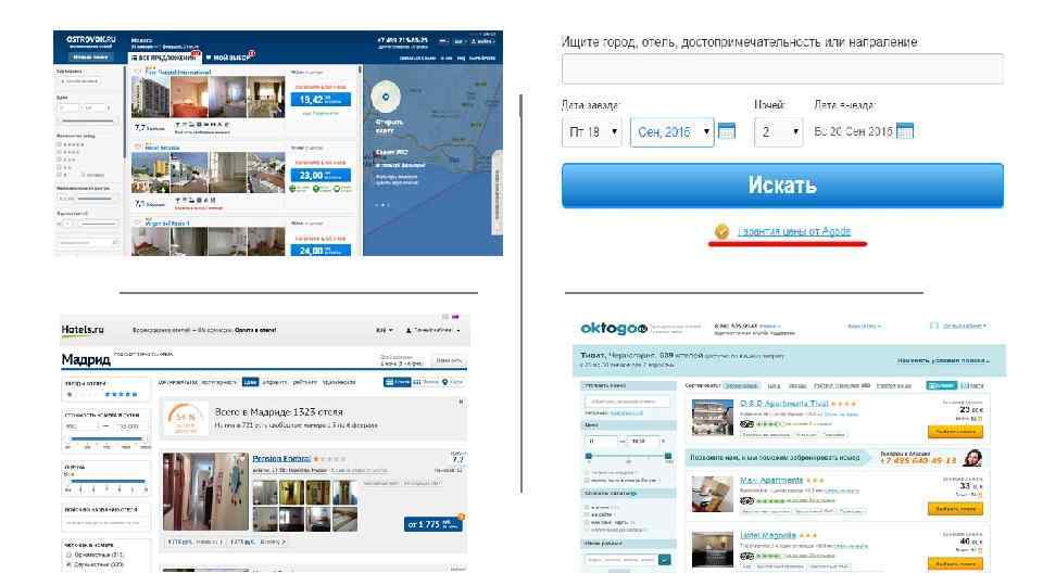Сервисы онлайн-резервирования гостиниц Первый и очень надёжный российский поисковик отелей. Сравнивает лучшие предложения и цены по 70 сайтам бронирования отелей, предлагая лучшие варианты по Один из самых известных поисковиков соотношению цена и качество. дешёвых авиабилетов на постсоветском пространстве. Позволяет также забронировать дешёвую гостиницу, ж/д по России, пакеты авиаперелёт + отель, оформить страховой полис. Крупный российский портал бронирования отелей. Доступ к огромной базе отелей, хостелов, апартаментов и гостевых домов по всему миру через партнёрство с Expedia