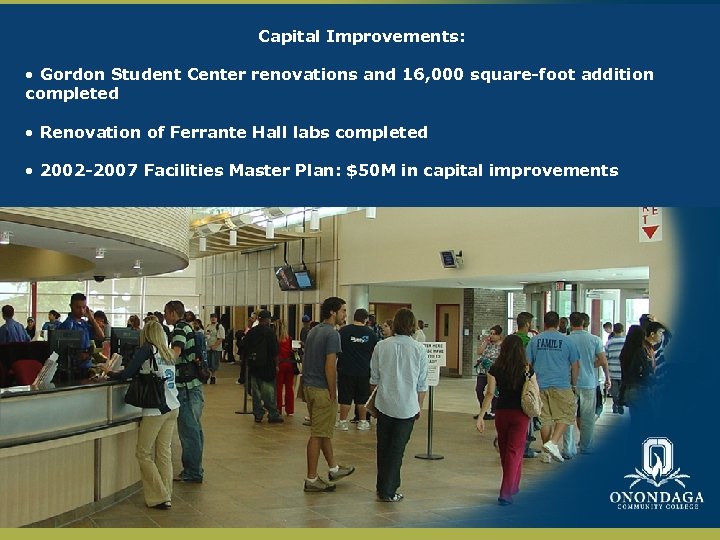 Capital Improvements: • Gordon Student Center renovations and 16, 000 square-foot addition completed • Renovation of Ferrante Hall labs completed • 2002 -2007 Facilities Master Plan: $50 M in capital improvements