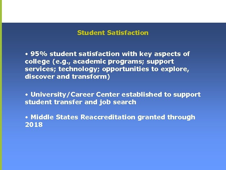 Student Satisfaction • 95% student satisfaction with key aspects of college (e. g. , academic programs; support services; technology; opportunities to explore, discover and transform) • University/Career Center established to support student transfer and job search • Middle States Reaccreditation granted through 2018