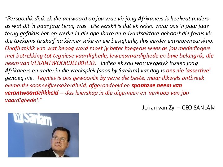"Persoonlik dink ek die antwoord op jou vrae vir jong Afrikaners is heelwat anders as wat dit 'n paar jaar terug was. Die verskil is dat ek reken waar ons 'n paar jaar terug gefokus het op werke in die openbare en privaatsektore behoort die fokus vir die toekoms te skuif na kleiner sake en eie besighede, dus eerder entrepreneurskap. Onafhanklik van wat beoog word moet jy beter toegerus wees as jou mededingers met betrekking tot tegniese vaardighede, lewensvaardighede en baie belangrik, die neem van VERANTWOORDELIKHEID. Indien ek sou wou vergelyk tussen jong Afrikaners en ander in die werksplek (soos by Sanlam) vandag is ons nie 'assertive' genoeg nie. Tegnies is ons gewoonlik by verre die beste, maar dikwels ontbreek elemente soos selfversekerdheid, afgerondheid en spontane neem van verantwoordelikheid -- dus leierskap in die algemeen en 'verkoop van jou vaardighede'. " Johan van Zyl – CEO SANLAM