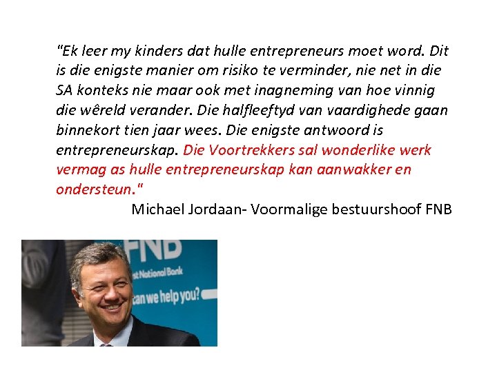 "Ek leer my kinders dat hulle entrepreneurs moet word. Dit is die enigste manier om risiko te verminder, nie net in die SA konteks nie maar ook met inagneming van hoe vinnig die wêreld verander. Die halfleeftyd van vaardighede gaan binnekort tien jaar wees. Die enigste antwoord is entrepreneurskap. Die Voortrekkers sal wonderlike werk vermag as hulle entrepreneurskap kan aanwakker en ondersteun. " Michael Jordaan- Voormalige bestuurshoof FNB