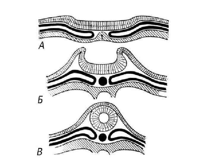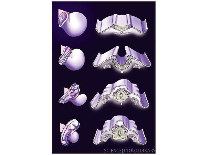 ОБРАЗОВАНИЕ НЕРВНОЙ ТРУБКИ НЕЙРУЛЯЦИЯ СТАДИИ (16 – 22 ДНИ): 1. ИНДУКЦИЯ ОБРАЗОВАНИЯ НЕРВНОЙ ПЛАСТИНКИ 2. ОБРАЗОВАНИЕ НЕРВНОГО ЖЕЛОБКА 3. ОБРАЗОВАНИЕ И МИГРАЦИЯ КЛЕТОК НЕРВНОГО ГРЕБНЯ 4. ЗАМЫКАНИЕ НЕРВНОЙ ТРУБКИ ЗАКРЫТИЕ ПЕРЕДНЕГО НЕЙРОПОРА – 25 -27 ДНИ ЗАКРЫТИЕ ЗАДНЕГО НЕЙРОПОРА – 28 -30 ДНИ