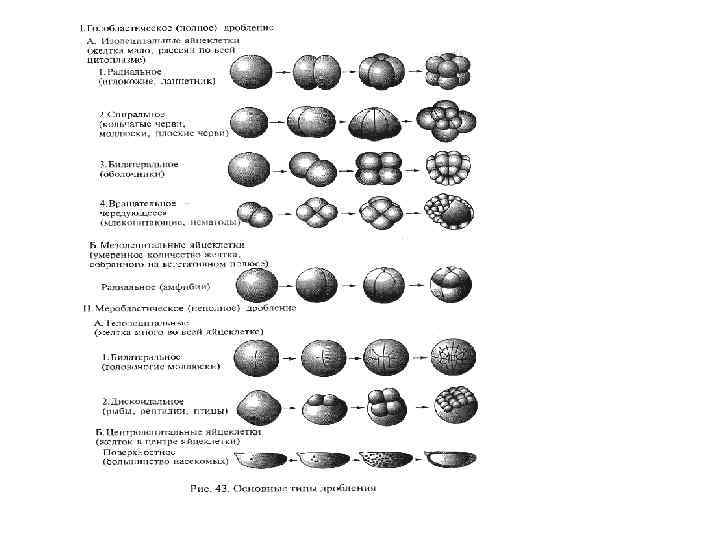• Процесс протекает до тех пор, пока эти показатели не достигнут значений, характерных для соматических клеток. Тип дробления зависит от количества желтка и его расположения в яйце. Если желтка мало и он равномерно распределен в цитоплазме (изолецитальные яйца: иглокожие, плоские черви, млекопитающие), то дробление протекает по типу полного равномерного: бластомеры одинаковы по размерам, дробится все яйцо. Если желток распределен неравномерно (телолецитальные яйца: амфибии), то дробление протекает по типу полного неравномерного: бластомеры — разной величины, те, которые содержат желток — крупнее, яйцо дробится целиком. При неполном дроблении желтка в яйцах настолько много, что борозды дробления не могут разделить его целиком. Дробление яйца, у которого дробится только сконцентрированная на анимальном полюсе «шапочка» цитоплазмы, где находится ядро зиготы, называется неполным дискоидальным (телолецитальные яйца: пресмыкающиеся, птицы). При неполном поверхностном дроблении в глубине желтка происходят первые синхронные ядерные деления, не сопровождающиеся образованием межклеточных границ. Ядра, окруженные небольшим количеством цитоплазмы, равномерно распределяются в желтке. Когда их становится достаточно много, они мигрируют в цитоплазму, где затем после образования межклеточных границ возникает бластодерма (центролецитальные яйца: насекомые).