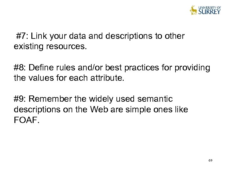 #7: Link your data and descriptions to other existing resources. #8: Define rules and/or best practices for providing the values for each attribute. #9: Remember the widely used semantic descriptions on the Web are simple ones like FOAF. 69