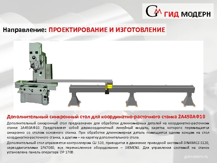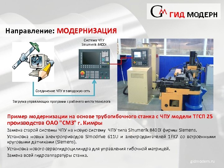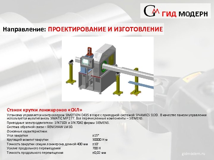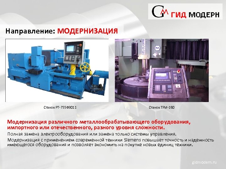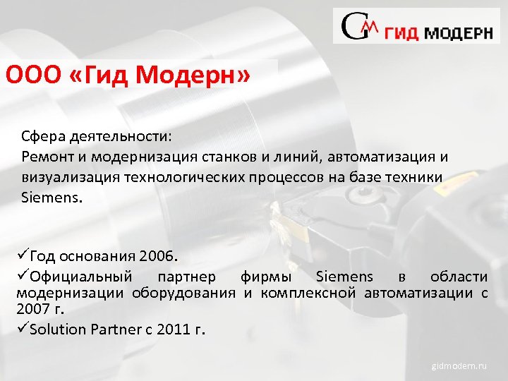 ООО «Гид Модерн» Сфера деятельности: Ремонт и модернизация станков и линий, автоматизация и визуализация технологических процессов на базе техники Siemens. üГод основания 2006. üОфициальный партнер фирмы Siemens в области модернизации оборудования и комплексной автоматизации с 2007 г. üSolution Partner c 2011 г. gidmodern. ru