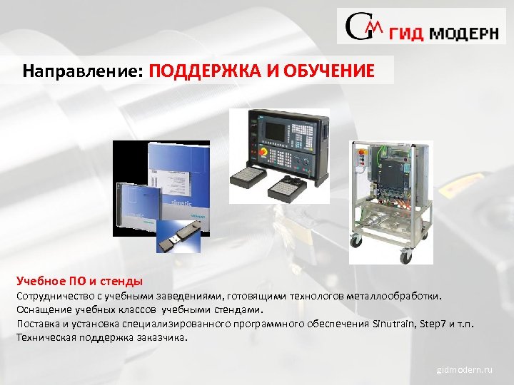 Направление: ПОДДЕРЖКА И ОБУЧЕНИЕ Учебное ПО и стенды Сотрудничество с учебными заведениями, готовящими технологов металлообработки. Оснащение учебных классов учебными стендами. Поставка и установка специализированного программного обеспечения Sinutrain, Step 7 и т. п. Техническая поддержка заказчика. gidmodern. ru