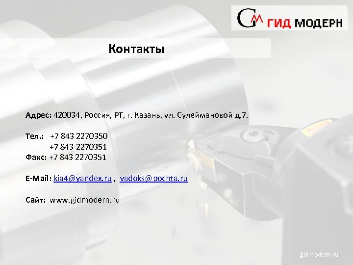 Контакты Адрес: 420034, Россия, РТ, г. Казань, ул. Сулеймановой д. 7. Тел. : +7 843 2270350 +7 843 2270351 Факс: +7 843 2270351 E-Mail: kia 4@yandex. ru , vadoks@pochta. ru Сайт: www. gidmodern. ru