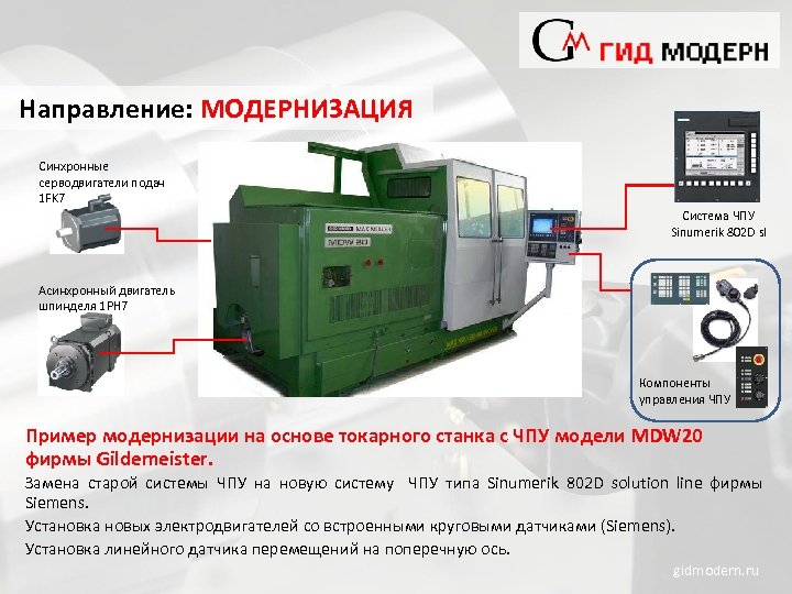 Направление: МОДЕРНИЗАЦИЯ Синхронные серводвигатели подач 1 FK 7 Система ЧПУ Sinumerik 802 D sl Асинхронный двигатель шпинделя 1 PH 7 Компоненты управления ЧПУ Пример модернизации на основе токарного станка с ЧПУ модели MDW 20 фирмы Gildemeister. Замена старой системы ЧПУ на новую систему ЧПУ типа Sinumerik 802 D solution line фирмы Siemens. Установка новых электродвигателей со встроенными круговыми датчиками (Siemens). Установка линейного датчика перемещений на поперечную ось. gidmodern. ru