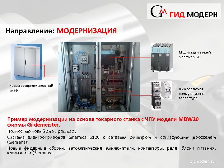 Направление: МОДЕРНИЗАЦИЯ Модули двигателей Sinamics S 120 Новый распределительный шкаф Низковольтная коммутационная аппаратура Пример модернизации на основе токарного станка с ЧПУ модели MDW 20 фирмы Gildemeister. Полностью новый электрошкаф; Система электроприводов Sinamics S 120 с сетевым фильтром и согласующим дросселем (Siemens); Новые фидерные сборки, автоматические выключатели, контакторы, реле, блоки питания, клеммники (Siemens). gidmodern. ru