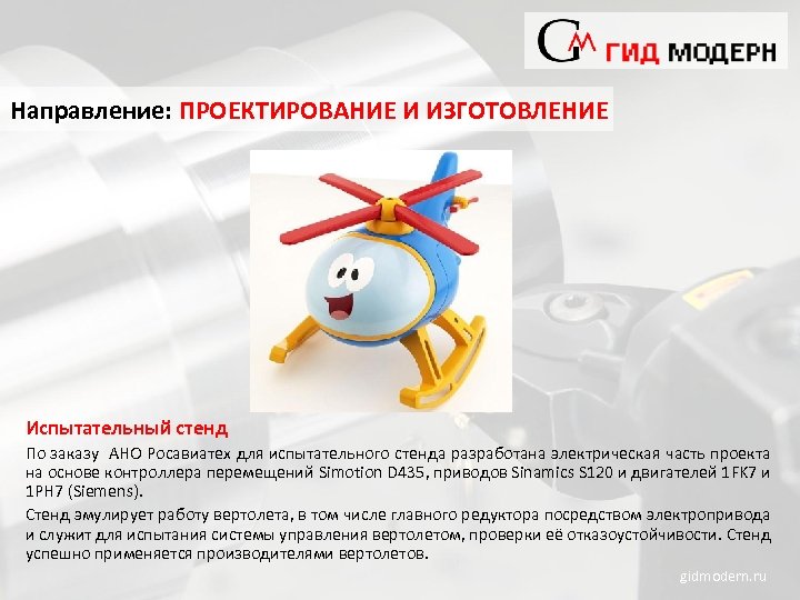 Направление: ПРОЕКТИРОВАНИЕ И ИЗГОТОВЛЕНИЕ Испытательный стенд По заказу АНО Росавиатех для испытательного стенда разработана электрическая часть проекта на основе контроллера перемещений Simotion D 435, приводов Sinamics S 120 и двигателей 1 FK 7 и 1 PH 7 (Siemens). Стенд эмулирует работу вертолета, в том числе главного редуктора посредством электропривода и служит для испытания системы управления вертолетом, проверки её отказоустойчивости. Стенд успешно применяется производителями вертолетов. gidmodern. ru