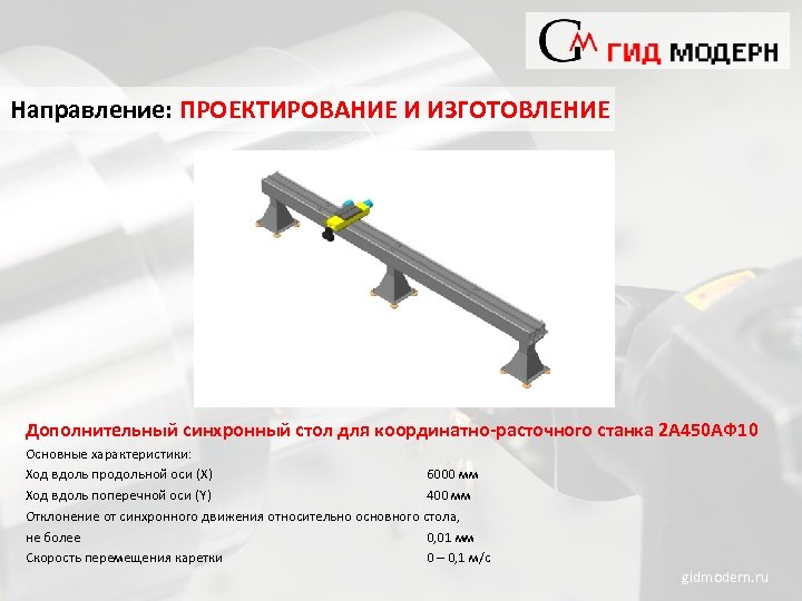Направление: ПРОЕКТИРОВАНИЕ И ИЗГОТОВЛЕНИЕ Дополнительный синхронный стол для координатно-расточного станка 2 А 450 АФ 10 Основные характеристики: Ход вдоль продольной оси (X) 6000 мм Ход вдоль поперечной оси (Y) 400 мм Отклонение от синхронного движения относительно основного стола, не более 0, 01 мм Скорость перемещения каретки 0 – 0, 1 м/с gidmodern. ru