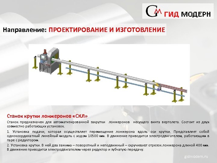 Направление: ПРОЕКТИРОВАНИЕ И ИЗГОТОВЛЕНИЕ Станок крутки лонжеронов «СКЛ» Станок предназначен для автоматизированной закрутки лонжеронов несущего винта вертолета. Состоит из двух совместно работающих установок. 1. Установка подачи, которая осуществляет перемещение лонжерона вдоль оси крутки. Представляет собой однокоординатный линейный модуль с ходом 10500 мм. В движение приводится электродвигателем, работающим в паре с редуктором. 2. Установка крутки. В ней два зажима – поворотный и неподвижный – скручивают отрезок лонжерона длиной 400 мм. В движение приводится электродвигателем через редуктор и зубчатую передачу. gidmodern. ru