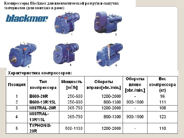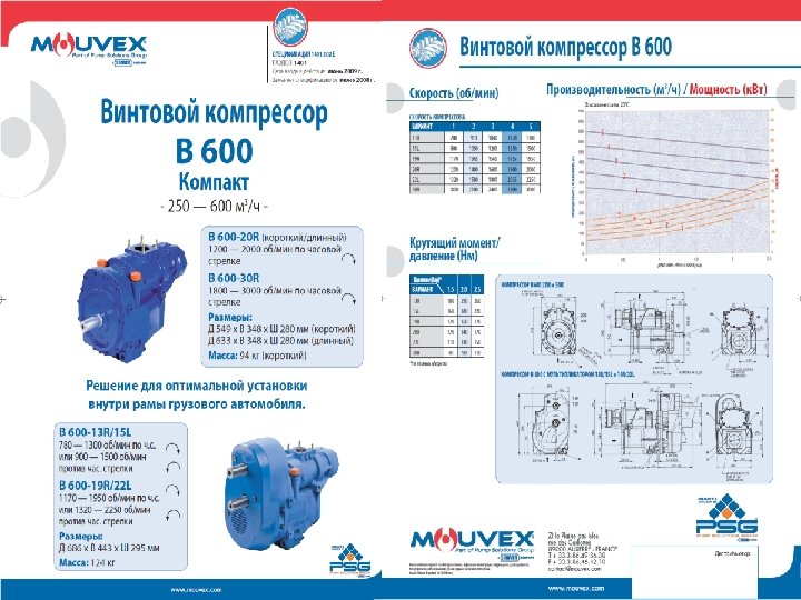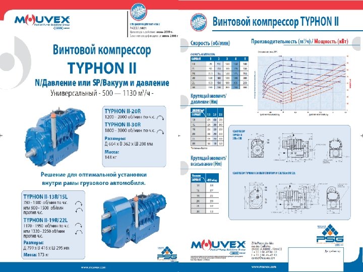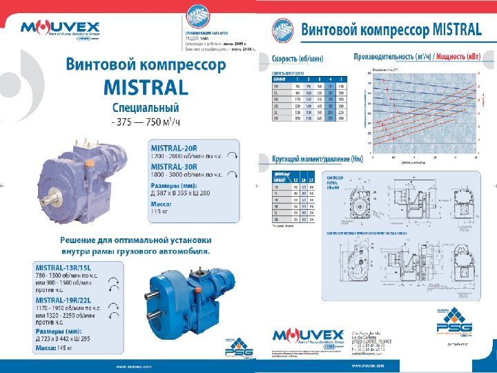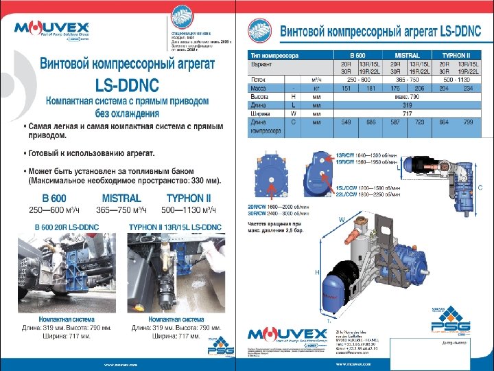 Сыпучие продукты Mouvex – один из ведущих мировых поставщиков безмасляных винтовых компрессоров для транспортных цистерн. Большой диапазон установок, обеспечивающих поток от 250 до 1500 м 3/час (147 -880 куб. футов в минуту) при 2, 5 бар. Mouvex разработал модульные охлаждаемые и неохлаждаемые системы, подходящие с общими аксессуарами для систем отбора мощности с прямым приводом, которые могут быть смонтированы на раме грузовика независимо от типа компрессора. Комплекты винтовых компрессоров могут быть легко установлены на все грузовые шасси как на производстве, так и в условиях сервисной станции. Опциональные приводные системы включают в себя клиноременный шкиф, гидравлический привод, электромотор или привод от двигателя. Винтовые компрессоры Mouvex надежно транспортируют широкий спектр сыпучих продуктов от мелкого порошка до крупных гранул.