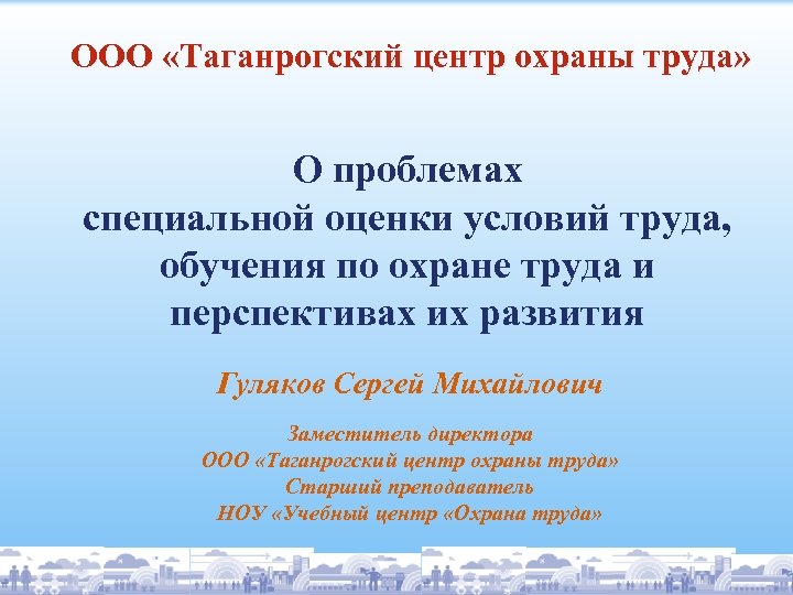 ООО «Таганрогский центр охраны труда» О проблемах специальной оценки условий труда, обучения по охране труда и перспективах их развития Гуляков Сергей Михайлович Заместитель директора ООО «Таганрогский центр охраны труда» Старший преподаватель НОУ «Учебный центр «Охрана труда»