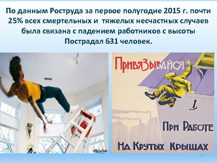 По данным Роструда за первое полугодие 2015 г. почти 25% всех смертельных и тяжелых несчастных случаев была связана с падением работников с высоты Пострадал 631 человек. 15