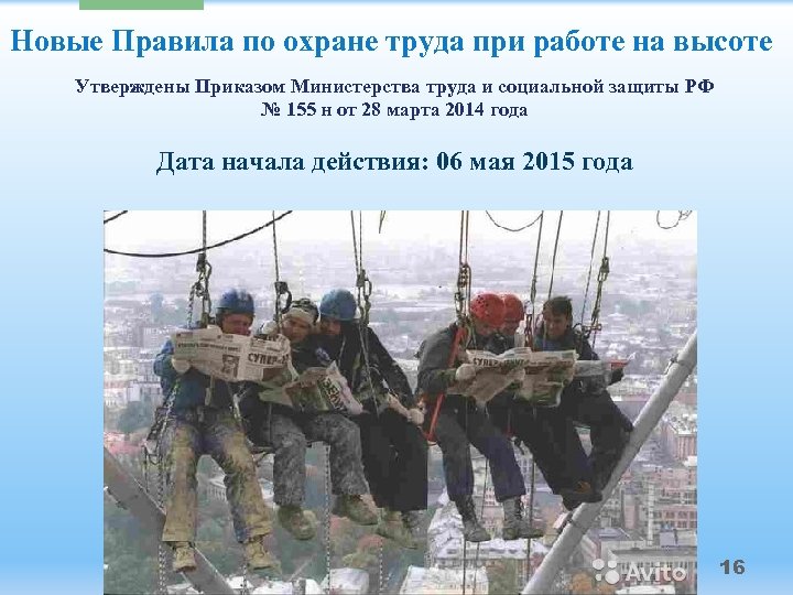 Новые Правила по охране труда при работе на высоте Утверждены Приказом Министерства труда и социальной защиты РФ № 155 н от 28 марта 2014 года Дата начала действия: 06 мая 2015 года 16