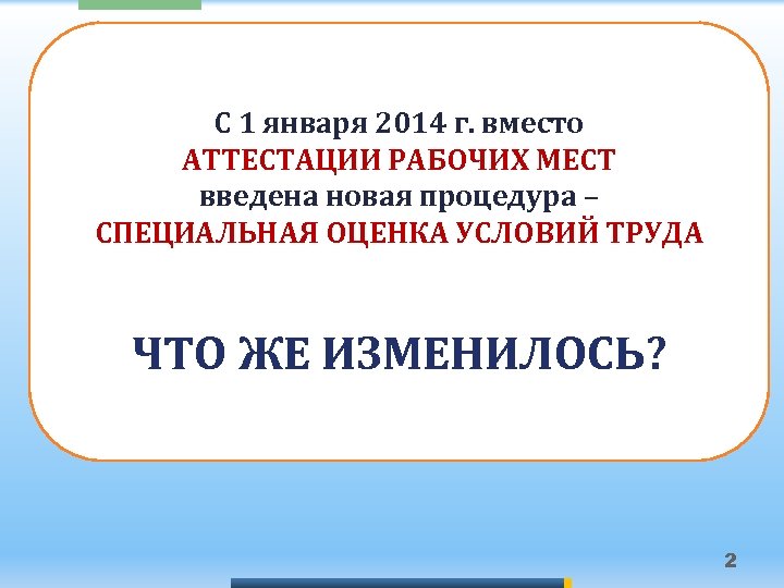 С 1 января 2014 г. вместо АТТЕСТАЦИИ РАБОЧИХ МЕСТ введена новая процедура – СПЕЦИАЛЬНАЯ ОЦЕНКА УСЛОВИЙ ТРУДА ЧТО ЖЕ ИЗМЕНИЛОСЬ? 2