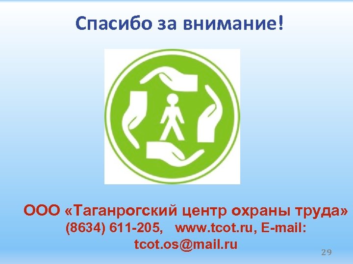 Спасибо за внимание! ООО «Таганрогский центр охраны труда» (8634) 611 -205, www. tcot. ru, E-mail: tcot. os@mail. ru 29