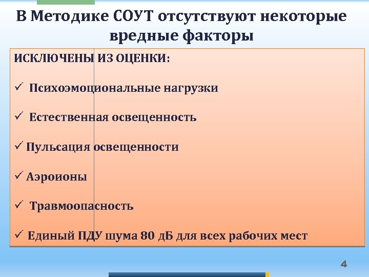 В Методике СОУТ отсутствуют некоторые вредные факторы ИСКЛЮЧЕНЫ ИЗ ОЦЕНКИ: ü Психоэмоциональные нагрузки ü Естественная освещенность ü Пульсация освещенности ü Аэроионы ü Травмоопасность ü Единый ПДУ шума 80 д. Б для всех рабочих мест 4