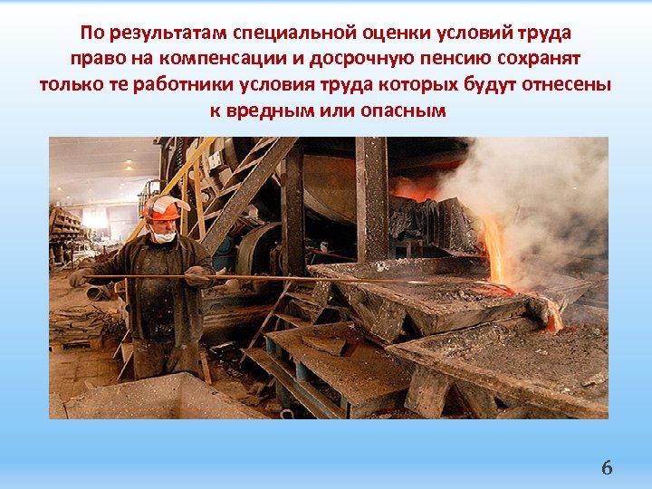 По результатам специальной оценки условий труда право на компенсации и досрочную пенсию сохранят только те работники условия труда которых будут отнесены к вредным или опасным 6