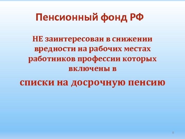 Пенсионный фонд РФ НЕ заинтересован в снижении вредности на рабочих местах работников профессии которых включены в списки на досрочную пенсию 8