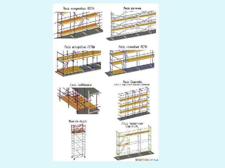 Характеристика лесов Mаксимальная высота, м Max нагрузка на настил , кгс/м 2 Область применения Диаметр и толщина стенки трубы, мм Возможность использования на объектах сложных форм (купола церквей, ёмкости и т. д. ) Вес среднего комплекта (Высота 10 м, Длина 15 м, настил на один ярус), кг Рамные Клиновые Хомутовые Штыревые 60 80 60 60 200 500 250 Отделочные работы, кирпичная кладка (на высоте до 20 м) 42 х 1, 5 (высота до 40 метров) 48 х 3, 5 (ЛСПШ-40) 48 х 3, 5 42 х 2 (высота до 60 метров) 60 х 3, 5 (Э-507) нет ннет есть нет 776. 4 1467. 3 2379. 8 1619. 4
