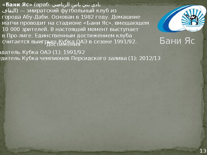 Бани Яс «Бани Яс» (араб. يضايرلا ساي ينب يدانادي فاقثلا )—эмиратскийфутбольный клуб из города. Абу-Даби. Основан в 1982 году. Домашние матчи проводит на стадионе «Бани Яс» , вмещающем 10 000 зрителей. В настоящий момент выступает в. Про-лиге. Единственным достижением клуба считается выигрыш Кубка ОАЭ в сезоне 1991/92. Достижения Обладатель. Кубка ОАЭ(1): 1991/92 Победитель. Кубка чемпионов Персидского залива(1): 2012/