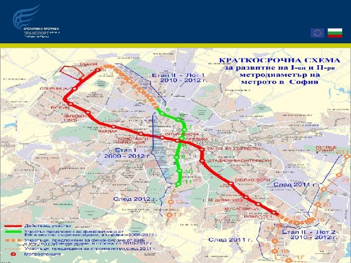 ЕТАПИ НА ПРОЕКТА ЗА РАЗШИРЕНИЕ НА МЕТРОТО В СОФИЯ - Етап І - Включва централен участък от Линия 2: „Пътен възел Надежда (МС 5 -II) - Централна ж. п. гара - пл. Света Неделя - бул. Черни връх” (МС 11 -II) - Етап ІІ - Включва два лота: Лот 1 - участък от Линия 2 „ж. к. Обеля - ж. к. Надежда - Пътен възел Надежда”; Лот 2 - участък от Линия 1 „ж. к. Младост 1 - Младост 3 - бул. Цариградско шосе” (част от трасето „Младост - Дружба - Летище”)