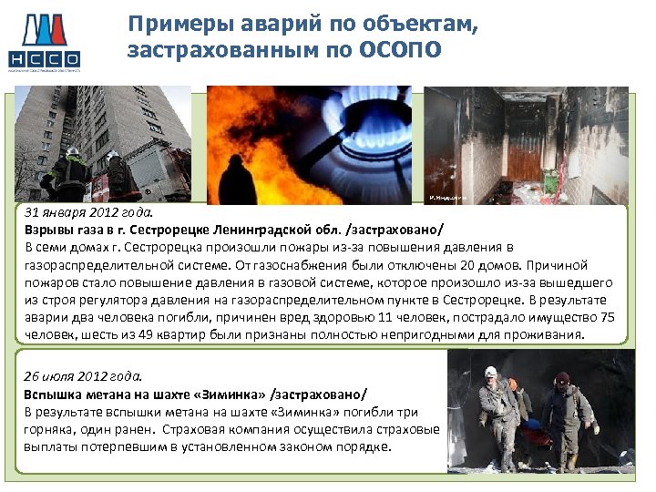 Примеры аварий по объектам, застрахованным по ОСОПО 31 января 2012 года. Взрывы газа в г. Сестрорецке Ленинградской обл. /застраховано/ В семи домах г. Сестрорецка произошли пожары из-за повышения давления в газораспределительной системе. От газоснабжения были отключены 20 домов. Причиной пожаров стало повышение давления в газовой системе, которое произошло из-за вышедшего из строя регулятора давления на газораспределительном пункте в Сестрорецке. В результате аварии два человека погибли, причинен вред здоровью 11 человек, пострадало имущество 75 человек, шесть из 49 квартир были признаны полностью непригодными для проживания. 26 июля 2012 года. Вспышка метана на шахте «Зиминка» /застраховано/ В результате вспышки метана на шахте «Зиминка» погибли три горняка, один ранен. Страховая компания осуществила страховые выплаты потерпевшим в установленном законом порядке.