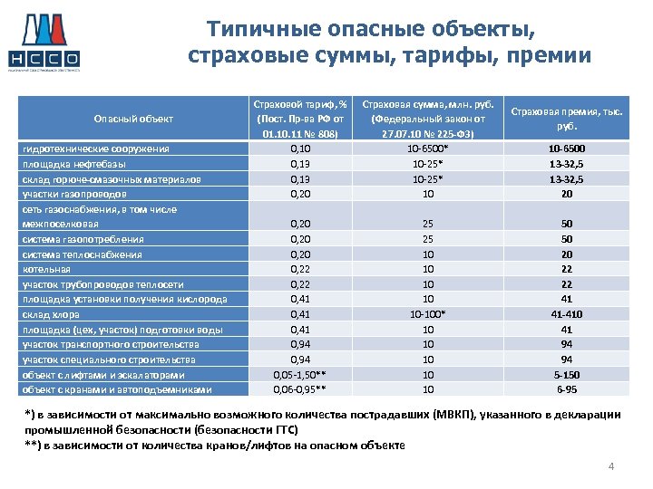 Типичные опасные объекты, страховые суммы, тарифы, премии Опасный объект гидротехнические сооружения площадка нефтебазы склад горюче-смазочных материалов участки газопроводов сеть газоснабжения, в том числе межпоселковая система газопотребления система теплоснабжения котельная участок трубопроводов теплосети площадка установки получения кислорода склад хлора площадка (цех, участок) подготовки воды участок транспортного строительства участок специального строительства объект с лифтами и эскалаторами объект с кранами и автоподъемниками Страховой тариф, % (Пост. Пр-ва РФ от 01. 10. 11 № 808) 0, 10 0, 13 0, 20 Страховая сумма, млн. руб. (Федеральный закон от 27. 07. 10 № 225 -ФЗ) 10 -6500* 10 -25* 10 0, 20 0, 22 0, 41 0, 94 0, 05 -1, 50** 0, 06 -0, 95** 25 25 10 10 10 -100* 10 10 10 Страховая премия, тыс. руб. 10 -6500 13 -32, 5 20 50 50 20 22 22 41 41 -410 41 94 94 5 -150 6 -95 *) в зависимости от максимально возможного количества пострадавших (МВКП), указанного в декларации промышленной безопасности (безопасности ГТС) **) в зависимости от количества кранов/лифтов на опасном объекте 4