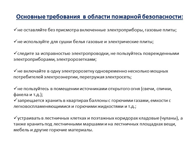 Основные требования в области пожарной безопасности: не оставляйте без присмотра включенные электроприборы, газовые плиты; не используйте для сушки белья газовые и электрические плиты; следите за исправностью электропроводки, не пользуйтесь поврежденными электроприборами, электророзетками; не включайте в одну электророзетку одновременно несколько мощных потребителей электроэнергии, перегружая электросеть; не пользуйтесь в помещении источниками открытого огня (свечи, спички, факела и т.д.); запрещается хранить в квартирах баллоны с горючими газами, емкости с легковоспламеняющимися и горючими жидкостями и т.д.; устраивать в лестничных клетках и поэтажных коридорах кладовые (чуланы), а также хранить под лестничными маршами и на лестничных площадках вещи, мебель и другие горючие материалы.