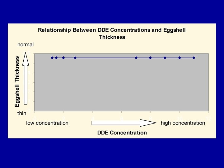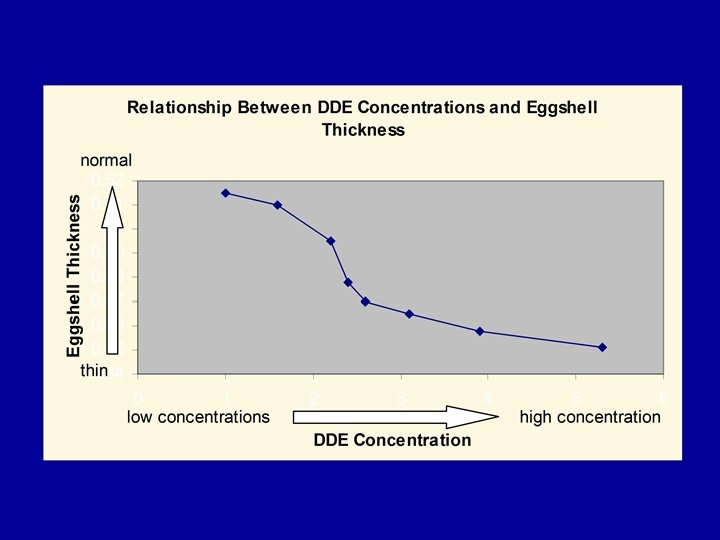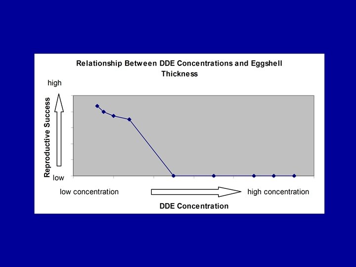 The Effects of DDE on Reproduction Species Effect on DDE: Critical Reproduction Concentration (measured in egg contents) Bald Eagle None < 3µg/g 1 Bald Eagle Failure 16 µg/g 1 Osprey Failure 17. 6 µg/g 2 1. Wiemeyer, S. N. et al. , 1984. Organochlorine pesticide, polychlorobiphenyl, and mercury residues in bald eagles, 1969 -1979, and their relationship to shell thinning and reproduction. Arch. Environ. Contam. Toxicol. , 13, 529. 2. Johnson, D. R. et al. , 1975. DDT and PCB levels in Lake Coeur d’Alene, Idaho osprey eggs, Bull. Environ. Contam. Toxicol. , 13, 401.