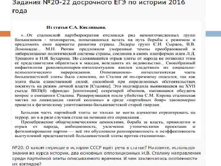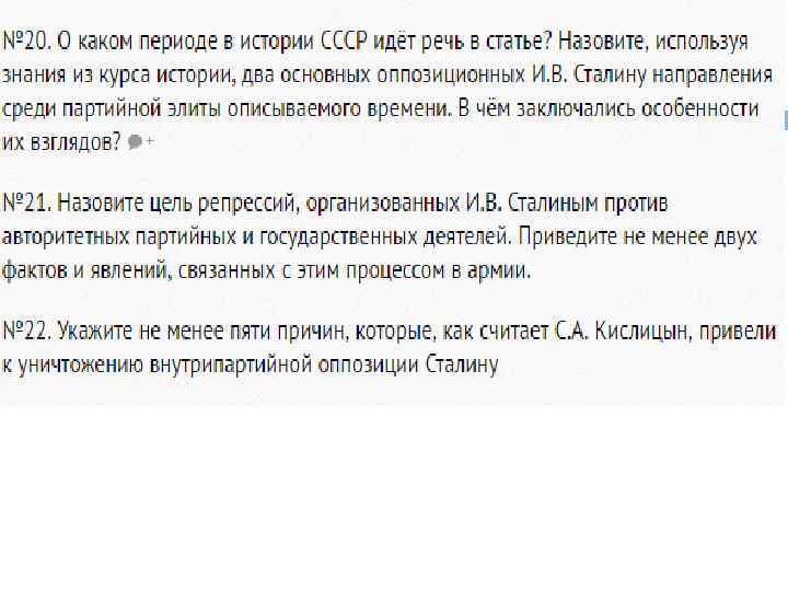 Ответы Группы же скрытно выделены в тексте: С. Сырцова и Т. Рютина (сторонников либерализации Советского союза и умеренных преобразований). Ну и затронем «партийных бояр» , расскажем кто это и получим 2 балла за двадцатое задание Идем дальше. Нужно назвать цель репрессий. Давайте оформим данное задание грамотно, как этого требует ЕГЭ и ленивый эксперт Цель: установление централизованной системы государственной власти и управления народными массами+ Факты и явления: 1) Были репрессированы многие представители РККА (пример: Тухачевский, Блюхер) 2) В годы советско-финской войны был нанесен серьезный удар по обороноспособности страны 5 причин Фетишизация ВКП (б) Инфантилизм Отрыв от народа Амбициозность членов партии Отстранение от человеческих ценностей
