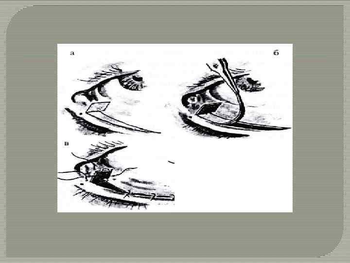 Операция Шарца Под слезной точкой удаляют лоскут конъюнктивы вместе с под- слизистой в виде равностороннего треугольника, с вершиной, обращенной к переходной складке. Длина боковых сторон равна 3 -4 мм. Основание треугольника выкраивают не по прямой, а в форме клина с тупой вершиной
